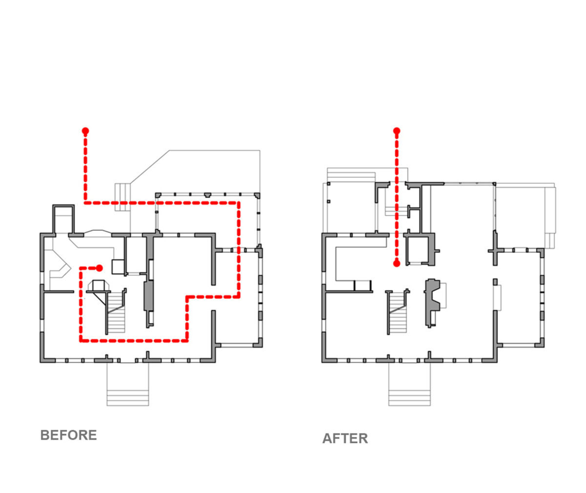 Renovations to this 1920’s home affected a dramatic shift in the character and functioning of the existing house. This design created a more direct and more visually appealing entry sequence from the garage and driveway into the house.